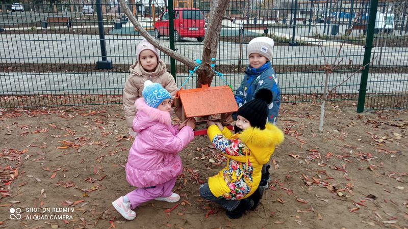 Выйдя на прогулку,воспитанники и ребята активисты "Движения Первых" насыпали в кормушки корм для синичек: