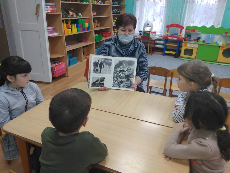 Во всех возрастных группах были проведены интерактивные беседы с воспитанниками: "Кто такой защитник отечества?", "Победе-77", "Защитникам Отечества-дань уважения отдаем!", "Я и Отечество". Также, проведены занятия, на которых ребята рисовали, лепили, клеили поделки на заданную тему.
