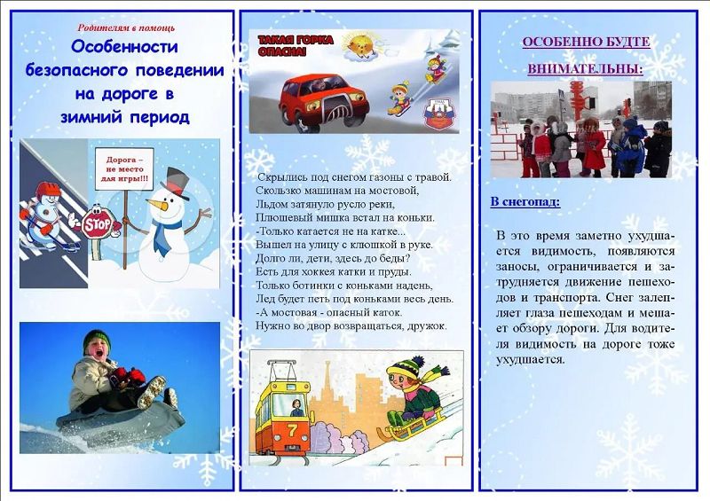 Прогулки в зимнее время самое любимое занятие большинства детей: это катание с горки, на коньках, лыжах и много других игр и забав, приносящих радость детям. Но омрачают эту радость различные травмы и простудные заболевания. Для того, чтобы научить ребёнка правильно действовать в той или иной ситуации, с детьми были проведены беседы: «Правила поведения на горке», «Чего нельзя делать на морозе», «Снег и сосульки», «Осторожно гололёд», «Не ходи по льду водоемов».С родителями воспитанников была проведена консультация «Безопасность детей зимой», "Осторожно, гололёд!","Безопасное движение на дорогах в зимний период", "Профилактика ГРИППА, Короновируса и ОРВИ" и т.д